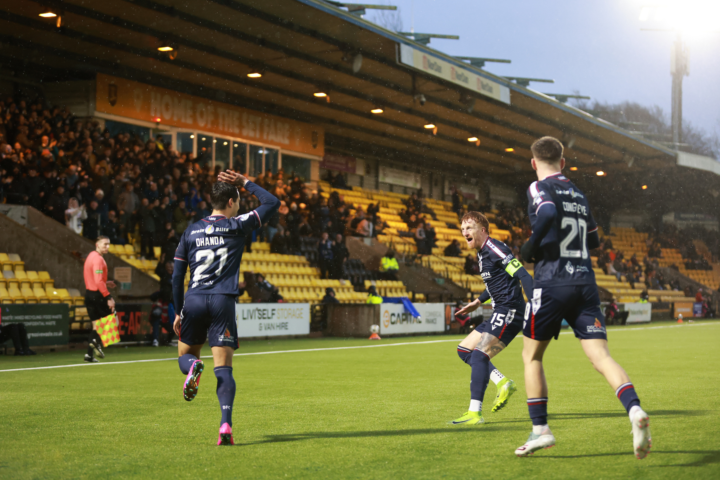 The remaining 12 minutes of play were frantic with Livingston hunting for a winner but the Dark Blues managed to hang on. The most noteworthy incident came in the last minute of added time when Livingston centre back Ryan McGowan was given a red card for fouling Ash Hay and denying a goalscoring opportunity as the Dee substitute was about to race clear 30 yards from goal.